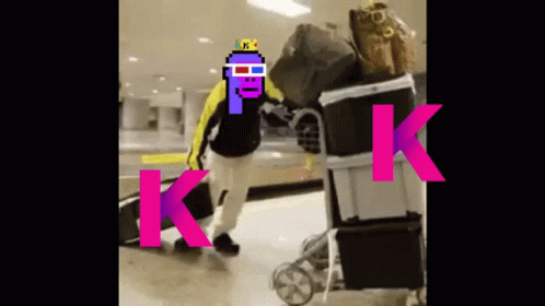 A person with a pixelated 'K' character on their head pushes luggage, surrounded by large 'K' letters, a Kadena KDA crypto meme.