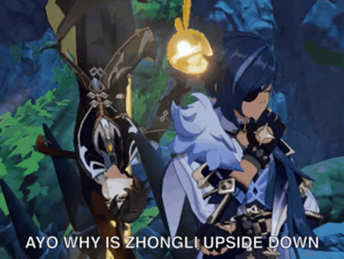 Kaeya observes an upside-down Zhongli in Genshin Impact, questioning the unusual sight.