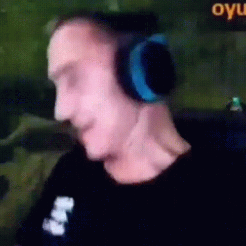 A man wearing blue headphones is moving his head rhythmically, possibly dancing or reacting to music.