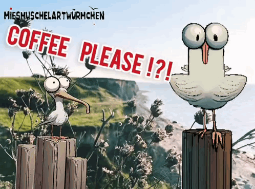 Two cartoon seagulls, one on a post, with the text 'COFFEE PLEASE !?!' displayed.