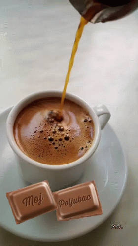 Coffee being poured into a cup, with chocolate pieces saying 'My Kiss' on the saucer.