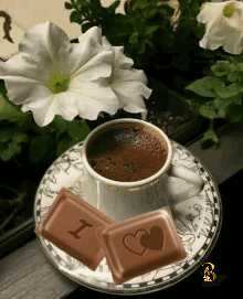 A delightful cup of coffee served with two chocolate bars, one bearing 'I' and the other two hearts, amidst beautiful white flowers.