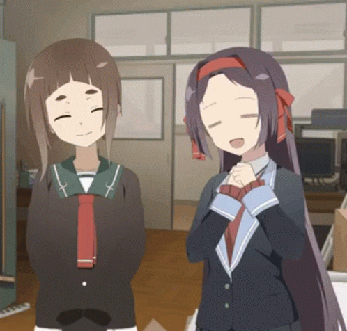 Kagajou Suzume and Uesato Hinata, two smiling anime girls, stand together in a room.