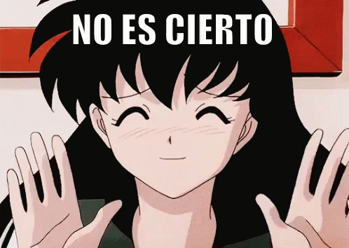Kagome from Inuyasha blushes and smiles, with the text 'No Es Cierto' (It's Not True) above her head.