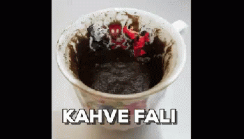 A close-up of a coffee cup with Kahve Falı (coffee fortune-telling) grounds, featuring miniature superhero figures.