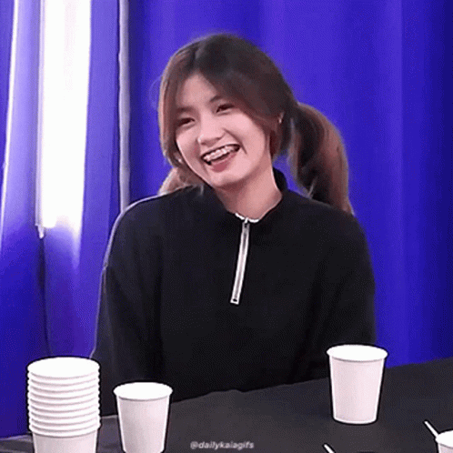 Kaia Charice smiles brightly, showing her braces, while sitting at a table with stacks of white paper cups.