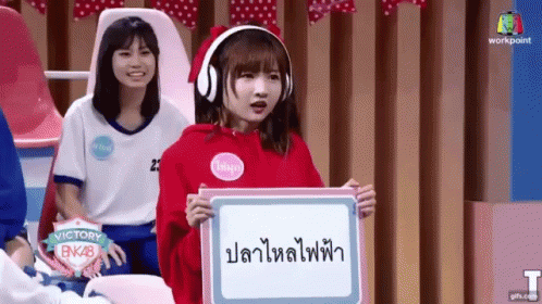 Kaimookbnk48, wearing headphones, reacts with a surprised and nervous expression while holding a sign.