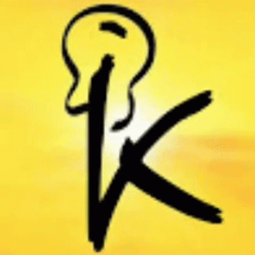 A black letter K logo with a melting or dripping effect, resembling a key or guitar headstock, on a vibrant yellow background.