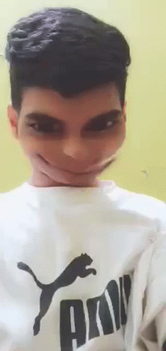 A young man makes funny faces with a face-distorting filter, wearing a white Puma sweatshirt.