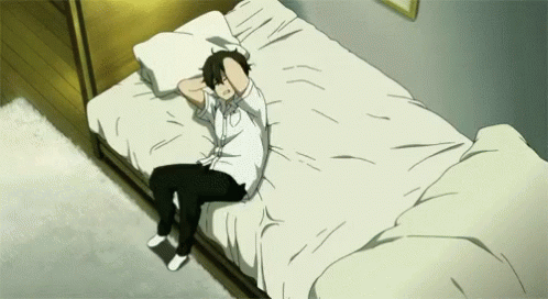 Kaito from Hyouka anime series relaxing on his bed, then suddenly falling off onto the floor.