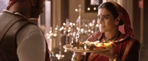 Kajol performs a traditional arti, holding a tray of offerings in a historical setting.