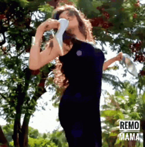 Kajal Aggarwal in a black dress, dancing outdoors and swinging a pair of silver high heels.