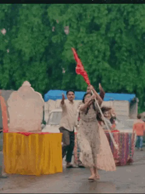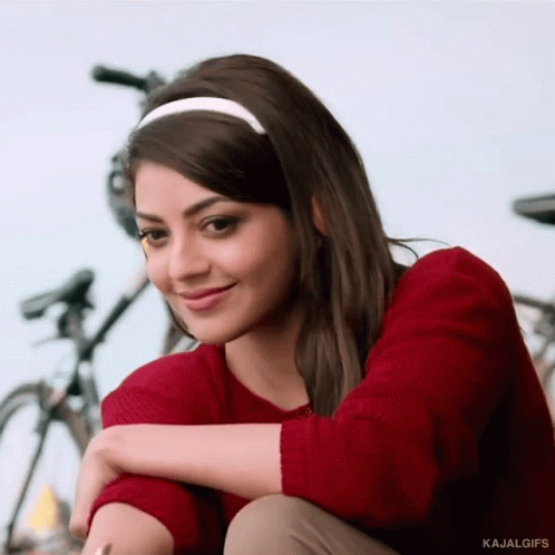 Kajal Agarwal, wearing a red sweater and white headband, smiles charmingly while sitting outdoors.