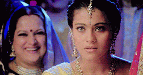 Kajol, dressed in traditional Indian attire, reacts shyly and hides behind another woman, likely in response to SRK.