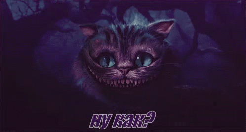 The Cheshire Cat from Alice in Wonderland grins with its iconic smile against a dark purple background.