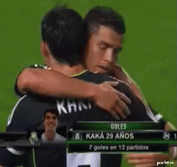 Football star Kaká celebrates a goal with a teammate, with his impressive stats displayed on screen.