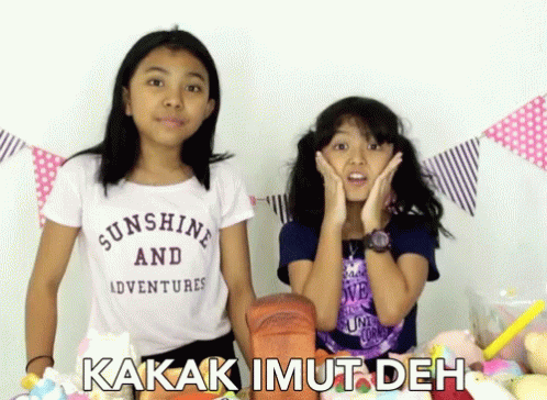 Keira and Charma react with astonishment, surrounded by squishy toys, with the caption 'Kakak Imut Deh'.