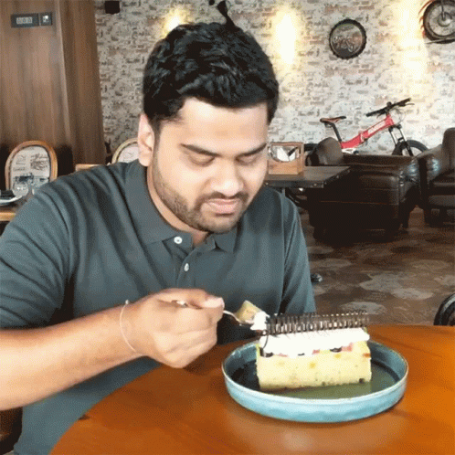 Ayush Chudiwala enjoying a delicious slice of cake with a fork at a cafe.
