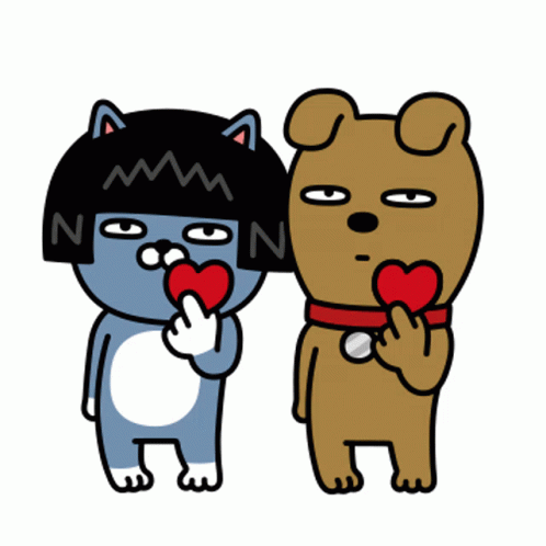 Kakao Friends Neo and Frodo, the cat and dog characters, holding red hearts with indifferent expressions.