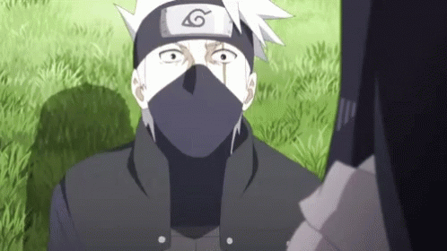 Kakashi Hatake, wearing his mask and headband, shakes his head and says "No, no, no, no!" in a grassy field.