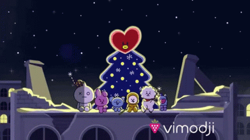 Animated BT21 characters celebrate Christmas around a festive tree, wishing 'Happy Holidays' with fireworks.