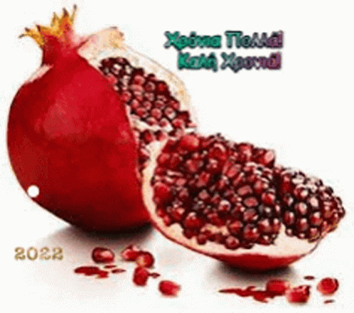 A vibrant red pomegranate, cut in half, symbolizing good luck for the New Year 2022.