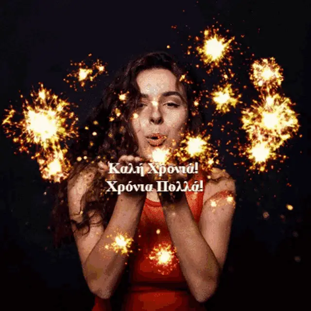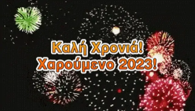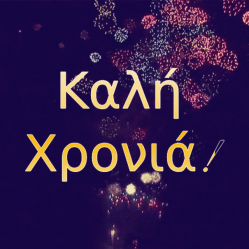 Vibrant fireworks illuminate the night sky, wishing everyone a Happy New Year with the Greek phrase "Καλή Χρονιά!".