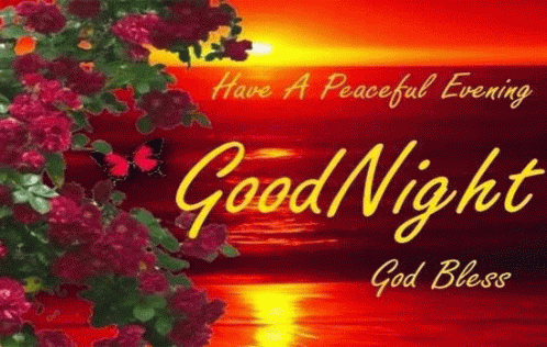 A beautiful sunset scene with red flowers, wishing a peaceful evening and goodnight with a blessing.
