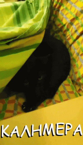 Black cat Naomi wakes up, stretching on a colorful blanket, ready for a good morning.