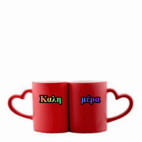 Two red mugs with heart-shaped handles, displaying the Greek phrase 'Καλημέρα' (Good Morning).