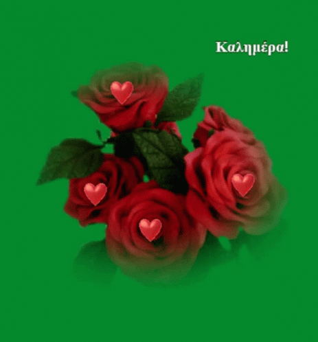 Vibrant red roses with glowing hearts on a green background, wishing 'Good morning' in Greek.