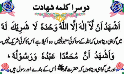 The Second Kalma (Shahadat) in Arabic with Urdu translation, featuring decorative roses and hearts.