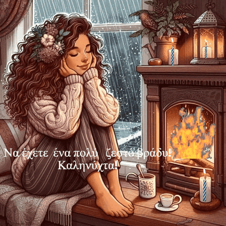 A woman with curly hair relaxes by a cozy fireplace on a rainy night, enjoying a warm drink.