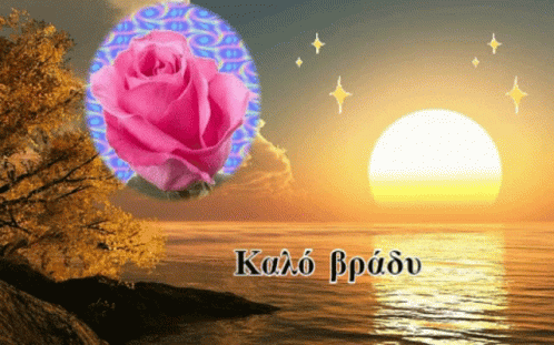 A beautiful greeting card featuring a pink rose, a serene sunset over water, and sparkling stars, wishing 'Good evening'.