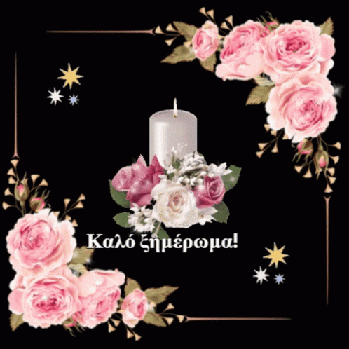 A beautiful image with a candle, pink roses, and stars on a black background, featuring the Greek text 'Καλό ξημέρωμα!' (Good morning!).