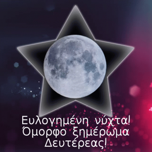 A full moon within a star graphic, with Greek text wishing a blessed night and beautiful Monday morning.