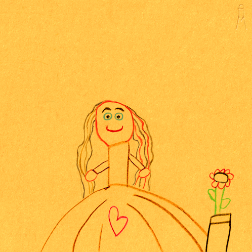 An animated child's drawing depicting puppy love with a girl and a heart.