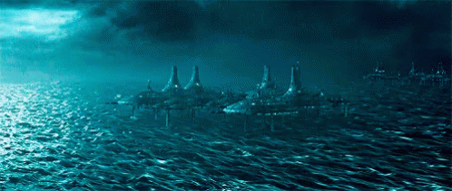 Futuristic city of Kamino from Star Wars, built on a vast ocean under a cloudy sky.