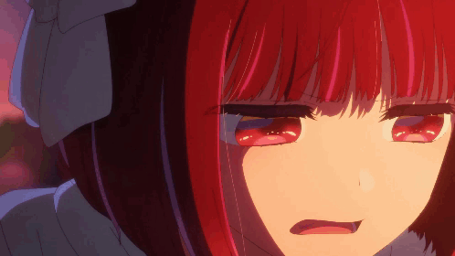 Close-up of Kana Arima from Oshi No Ko, showing a sad expression with red eyes and vibrant red hair.