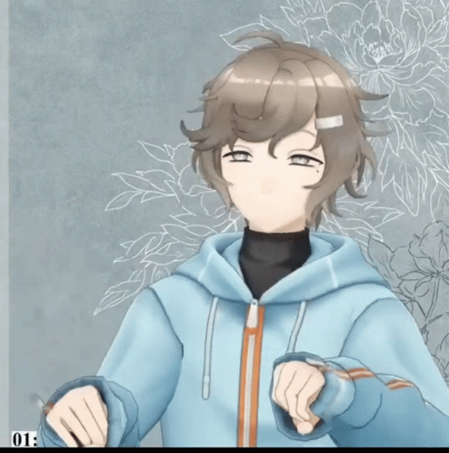 Animated VTuber Kanae from Nijisanji in a blue hoodie, making cute gestures with a floral background.