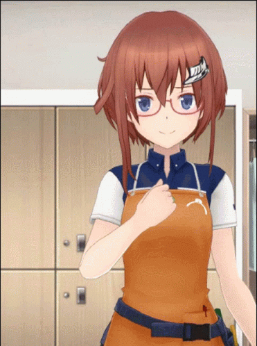 Kanagata Sugumi from Alice Gear Aegis transforms from an apron outfit to a bikini while making a heart gesture.