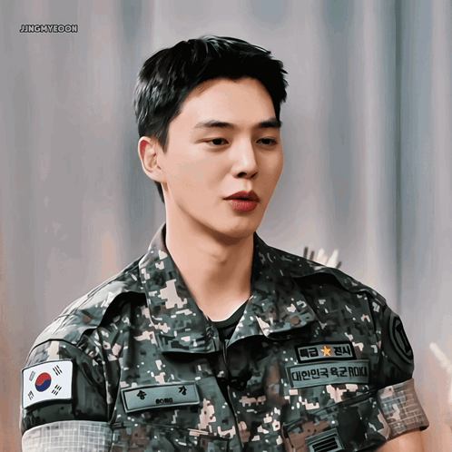 Actor Song Kang in his Republic of Korea Army uniform, featuring a South Korean flag patch and name tag.