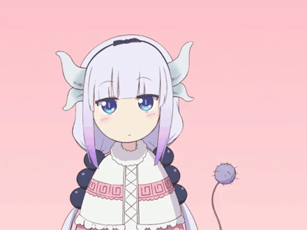 Kanna from Dragon Maid, a cute anime character with horns and a tail, stands with a neutral stare.