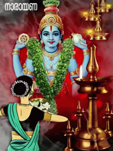 A devotional image featuring Lord Krishna (Kannan/Narayana) with a woman in prayer and traditional lamps.