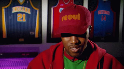 Kanye West adjusts his red 'SOUL' hat, pulling it down over his face in a playful gesture.