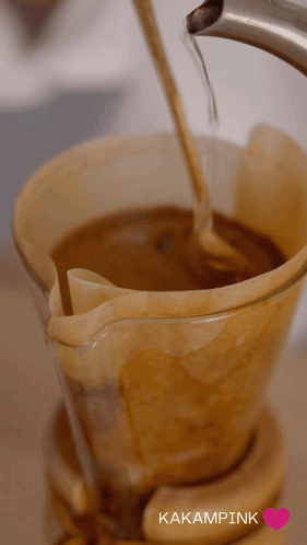 Pouring hot water over coffee grounds for a fresh morning brew, with a friendly 'Kape tayo!' message.