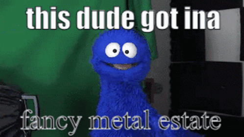 Kapuccino, a blue puppet, featured in a meme with the text 'this dude got ina fancy metal estate'.