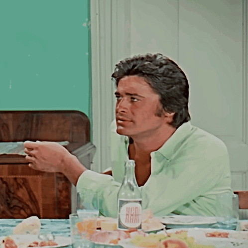 a man is sitting at a table with a bottle of yum ram