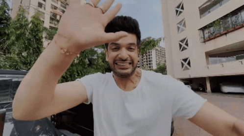 Karan Kundrra smiles and waves, then performs a playful dance in a residential area.