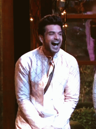 Karan Kundrra, dressed in a light patterned kurta, smiles and laughs, playfully covering his mouth.